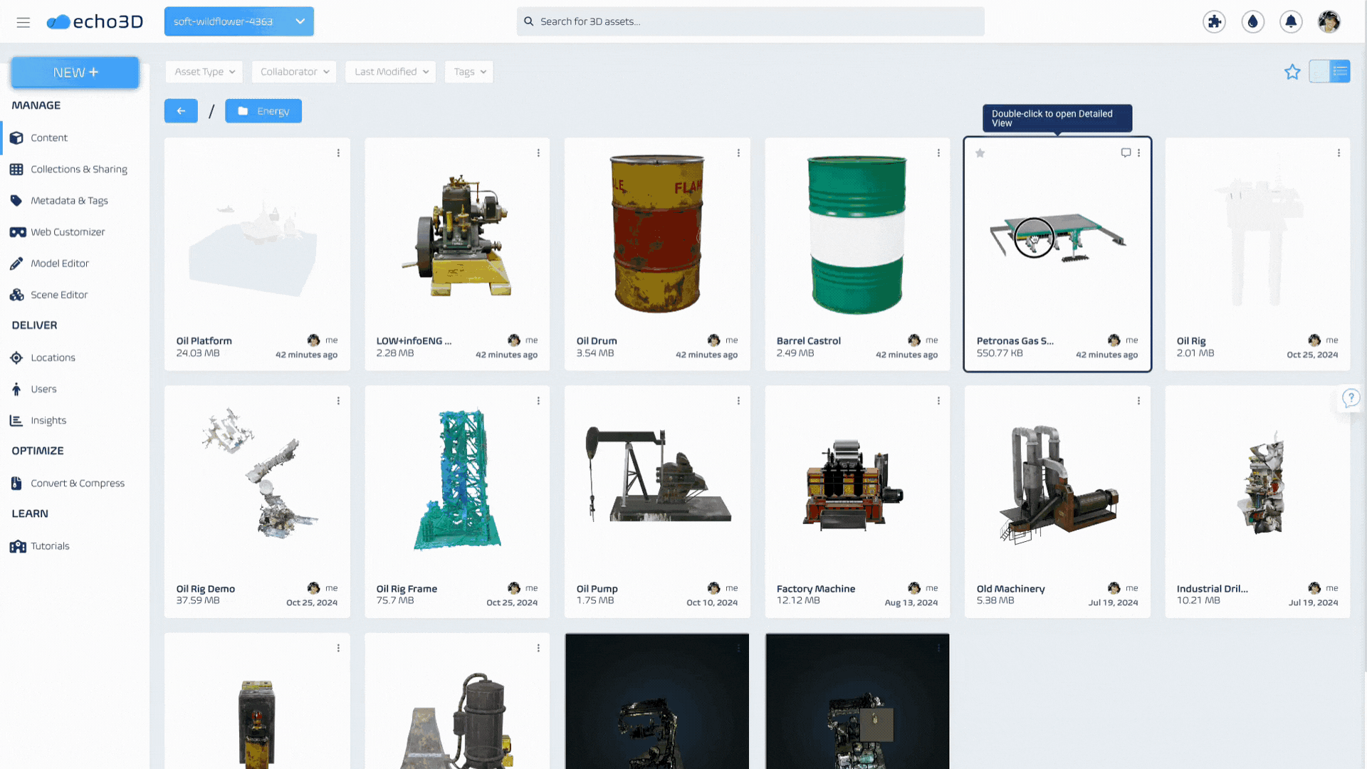 The energy industry is increasingly leveraging digital twins for infrastructure monitoring and optimization, covering everything from offshore platforms to energy grids. These complex digital twins rely on effective 3D asset management to ensure real-time, accurate data, and streamlined operations. echo3D’s 3D Digital Asset Management (3D DAM) platform addresses each of the sector’s pain points, transforming how teams manage and interact with 3D assets.